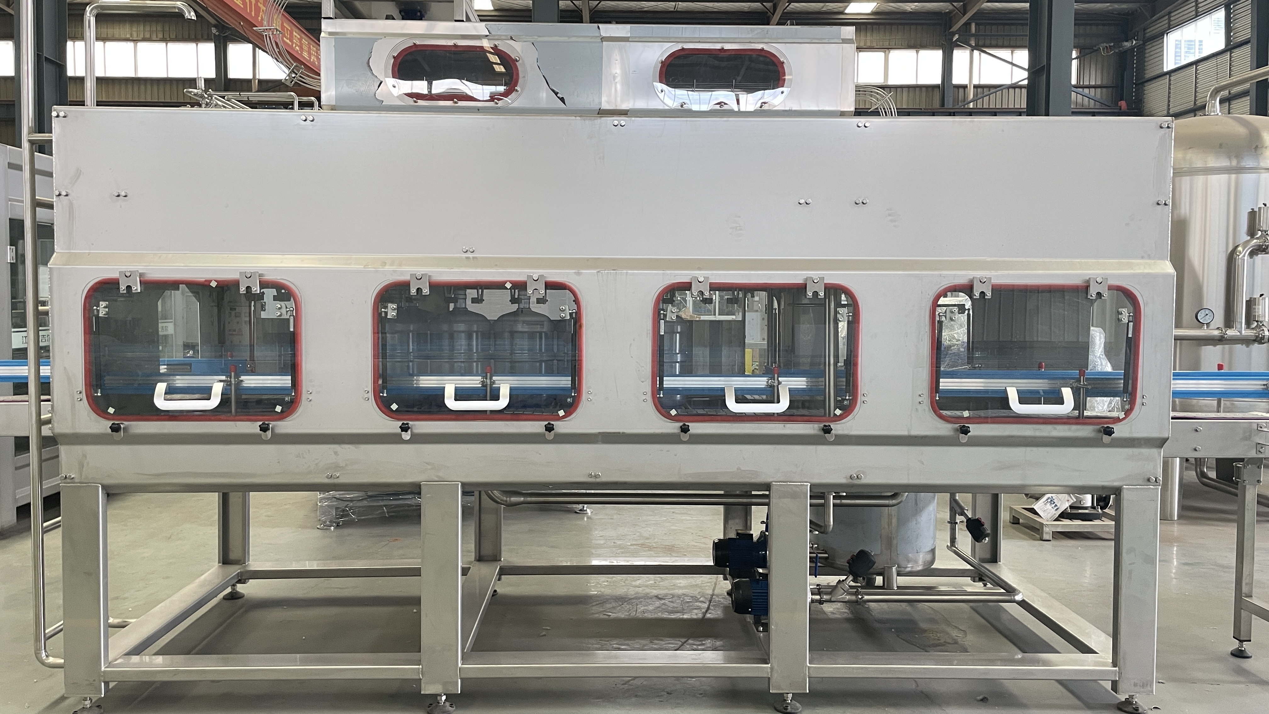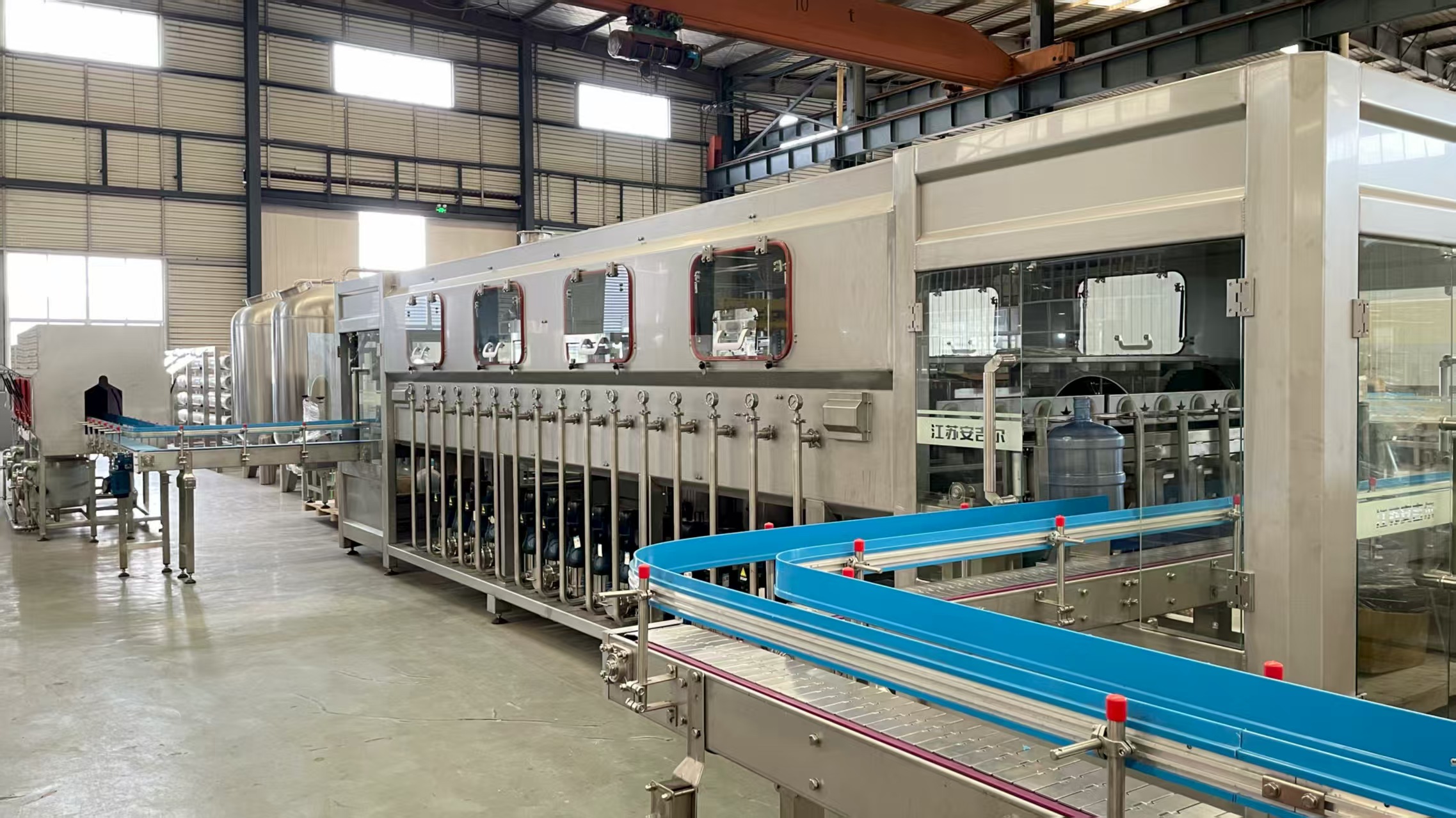本設備集自動拔蓋、洗桶、自動上瓶、內沖洗系統、灌裝、上蓋、套蓋、壓蓋、熱收縮膜、自動套標機、自動套袋機、碼垛機及成品輸送于一體,整個生產過程都有采用封閉式運行,加上紫外線殺菌、臭氧消毒,保證了整個洗瓶灌裝過程完全達到國家衛生部門的有關標準和規定,有效防止了飲用水在灌裝過程中可能發生的二次污染,做到無菌生產。